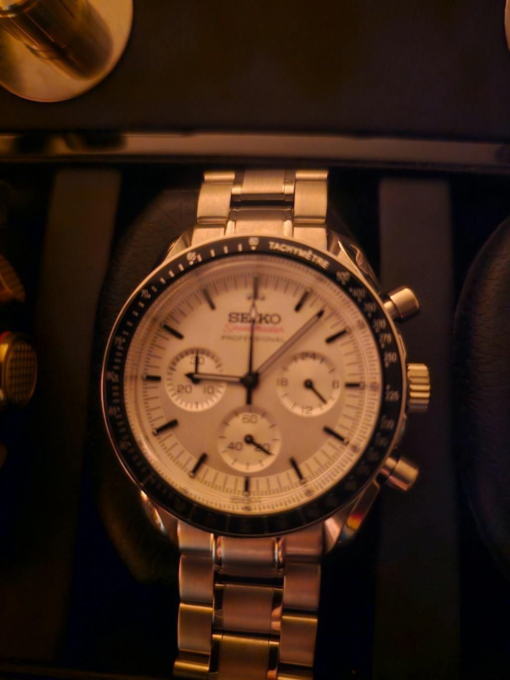 Very pleased with this mod adaptation of the “Daniel Craig” Omega Speedmaster. The Seiko quartz movement keeps outstanding time. I own an Omega black dial Speedy. This Somerville-built white dial is even more attractive. Indeed, the white dial is as carefully sculpted as the Omega. And at a fraction of the price. And the band is also excellent